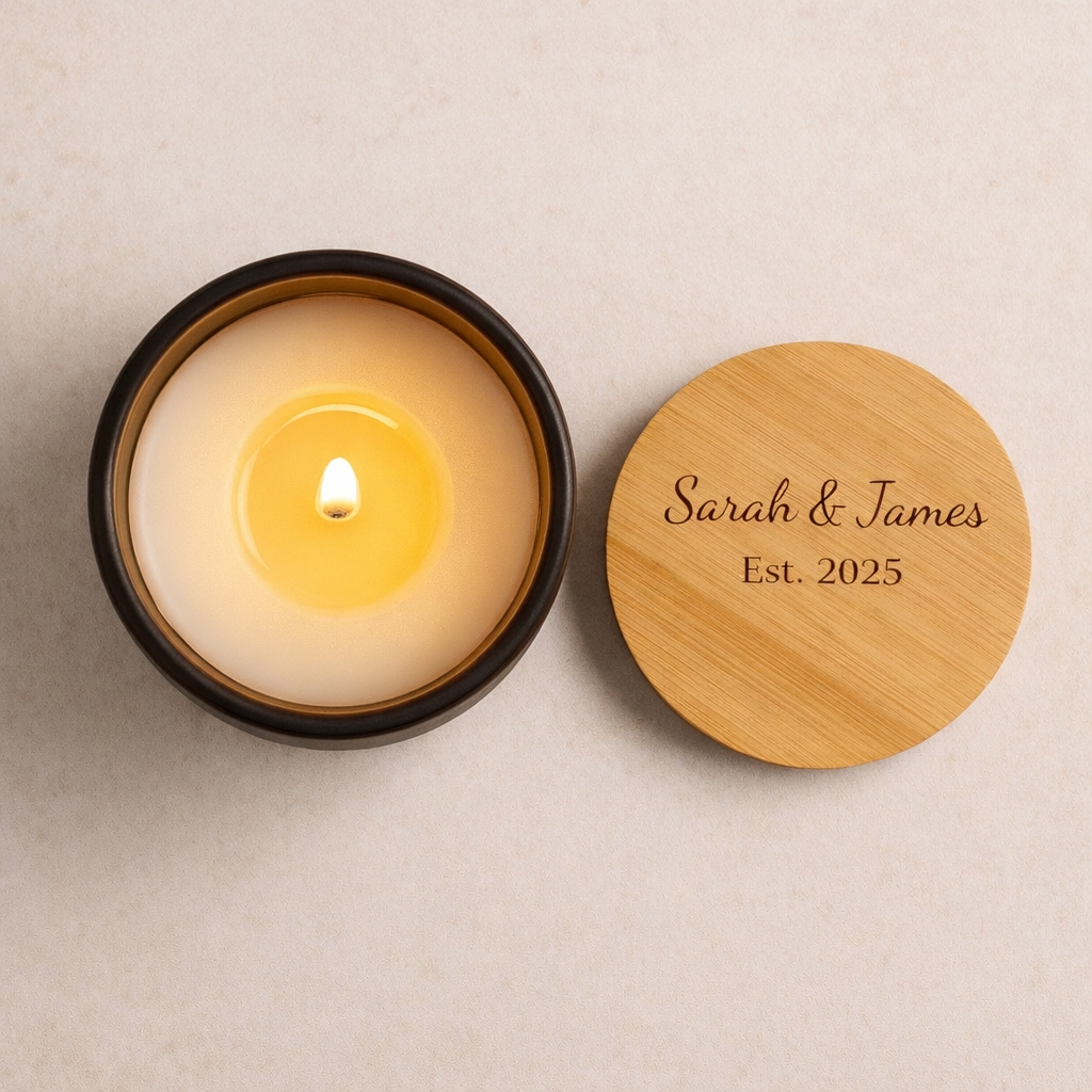 Each candle is presented in a sleek glass jar and topped with a natural bamboo lid, engraved with your chosen wording. Whether given as a wedding gift, anniversary keepsake, memorial candle, or a thoughtful piece for your own home, it’s designed to mark meaningful moments with simplicity and care.